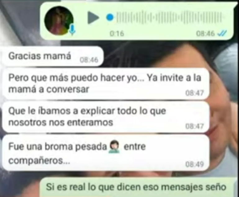 En un chat que mantuvo con una mamá, una maestra a cargo le dijo que “fue una broma pesada entre compañeros”. Los familiares se acercaron hasta la comisaría segunda para sumar los testimonios de sus hijos. Además, los nenes relataron que cuando la docente se enteró, lloraba y les decía que si ellos contaban algo iban a quedarse sin escuela y que la mamá del nene atacado era capaz de prender fuego el establecimiento.
