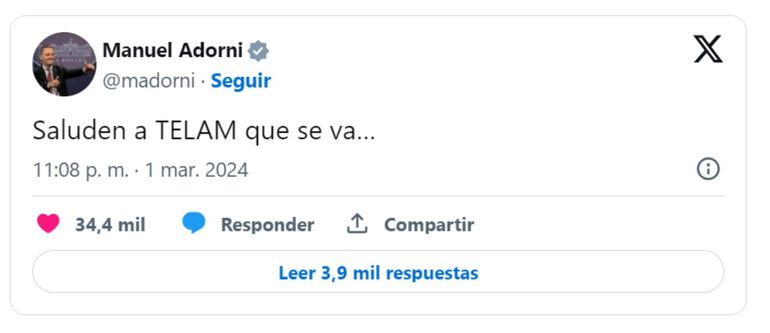A pesar de anticipar así el despido de sus casi 800 trabajadores, Adorni celebró y hasta se mofó de los despidos en su cuenta de X. "Saluden a Télam que se va..." celebró el vocero presidencial.