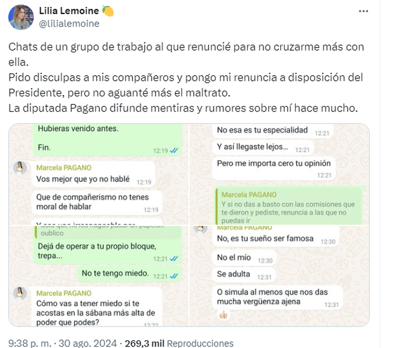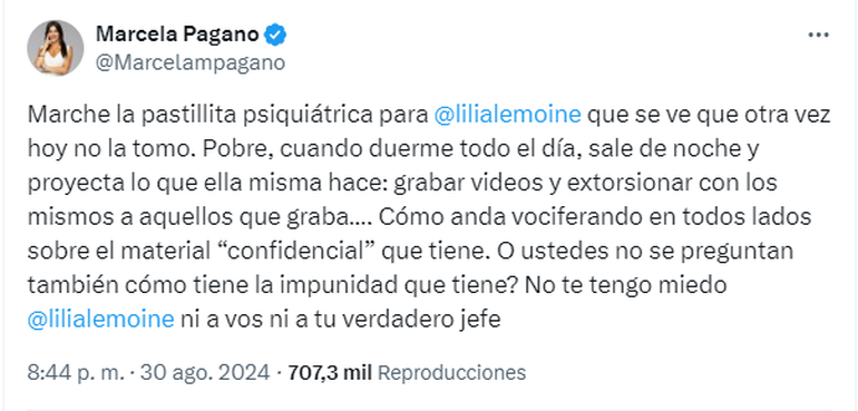 En su cuenta de X, Pagano tuiteó: "Marche la pastillita psiquiátrica para @lilialemoine que se ve que otra vez hoy no la tomó. Pobre, cuando duerme todo el día, sale de noche y proyecta lo que ella misma hace: grabar videos y extorsionar con los mismos a aquellos que graba".