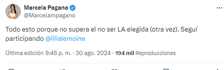 El cruce por las redes sociales continuó y Pagano fue al hueso contra Lemoine al sostener que "todo esto porque no supera el no ser LA elegida (otra vez). Seguí participando".