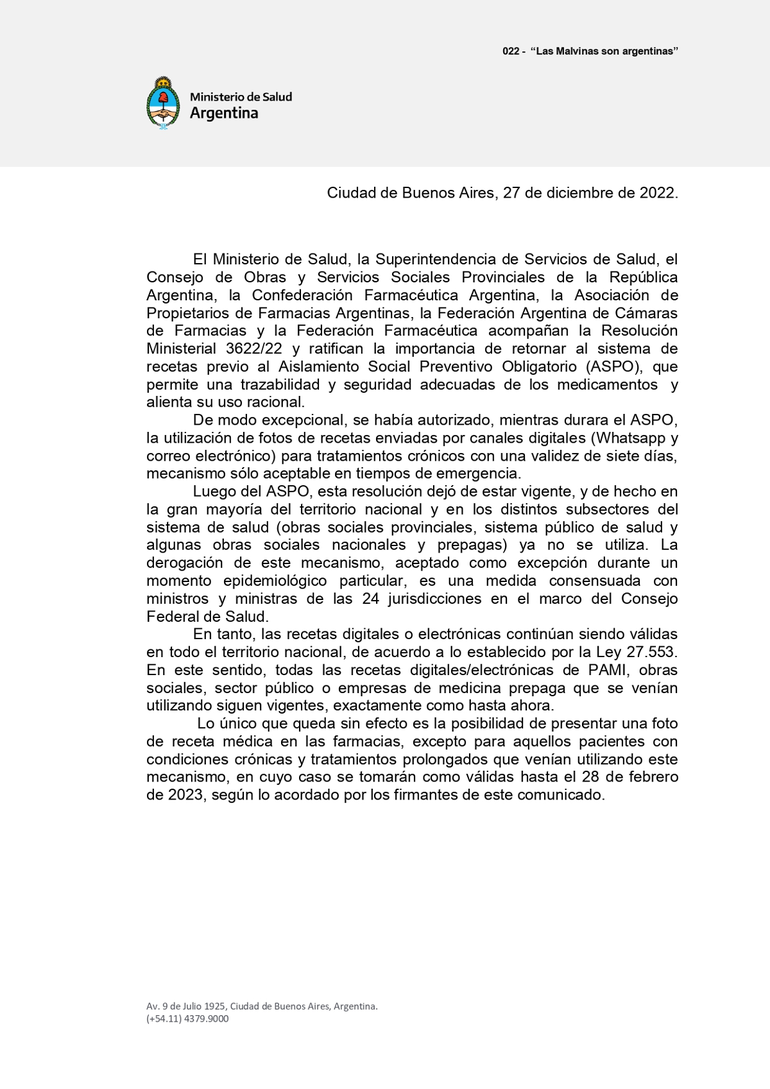 En un comunicado oficial, el Ministerio de Salud señaló que "en acuerdo con asociaciones farmacéuticas, el Consejo de Obras y Servicios Sociales Provinciales de la República Argentina y la Superintendencia de Salud, se definió que a aquellos pacientes con enfermedades crónicas que venían utilizando esta modalidad hasta hoy, se les aceptará la foto de la receta en las farmacias hasta el próximo 28 de febrero, para facilitar el proceso de transición".