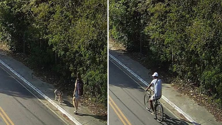 A las 7.05 la joven quedó registrada cuando caminaba por la vereda de una cinta asfáltica sin tránsito vehicular, llevando a su perro de la correa y con una mochila oscura sobre sus hombros, hasta que llegó a una curva que gira hacia la derecha y se perdió de vista detrás de la vegetación al costado del camino.