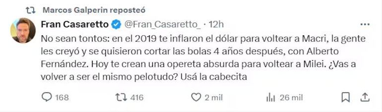 “No sean tontos: en el 2019 te inflaron el dólar para voltear a Macri, la gente les creyó y se quisieron cortar las bolas 4 años después, con Alberto Fernández”, comienza el mensaje escrito por Fran Casaretto, creador de contenido afín a las ideas libertarias, y que fue reposteado por Galperin en su propio perfil de X.
