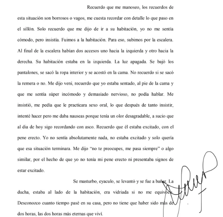 Según detalló, en la denuncia contó que se se sentaron en el sillón y empezaron a hablar. "Recuerdo que me manoseó, me dijo de ir a su habitación, yo no me sentía cómodo pero insistía. Me sentía incómodo y demasiado nervioso, no podía hablar", aseguró.