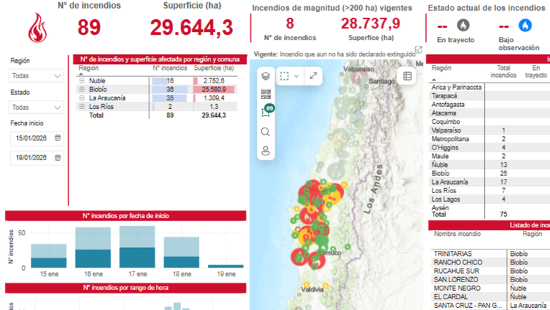 Según los datos que recolecta el CONAF, Corporación Nacional Forestal, son actualmente más de 50 los focos de incendios activos. Debido a la magnitud de los siniestros, durante la madrugada del domingo el Gobierno decretó Estado de Catástrofe en las regiones de Ñuble y BioBío.