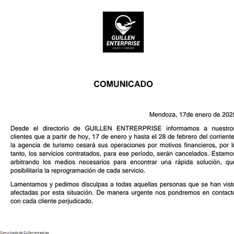 El comunicado tiene fecha del pasado viernes: “Informamos a nuestros clientes que a partir de hoy, 17 de enero y hasta el 28 de febrero del corriente; la agencia de turismo cesará sus operaciones por motivos financieros; por lo tanto, los servicios contratados para ese período serán cancelados”.