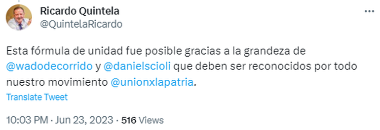 El gobernador de La Rioja, Ricardo Quintela, resaltó la "grandeza" de Wado de Pedro y Daniel Scioli , quienes "deben ser reconocidos por todo nuestro movimiento @unionxlapatria".