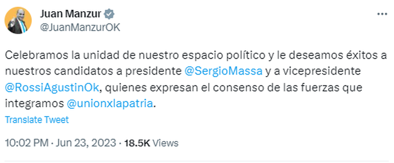 Finalmente, Juan Manzur, gobernador de Tucumán, celebró "la unidad de nuestro espacio político y le deseamos éxitos a nuestros candidatos a presidente Sergio Massa y a vicepresidente Agustín Rossi, quienes expresan el consenso de las fuerzas que integramos Unión por la Patria".