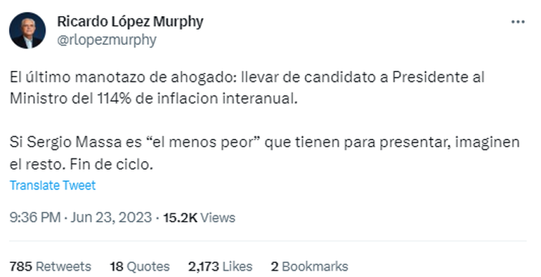 "El último manotazo de ahogado: llevar de candidato a Presidente al Ministro del 114% de inflación interanual. Si Sergio Massa es “el menos peor” que tienen para presentar, imaginen el resto. Fin de ciclo", expresó el diputado nacional, Ricardo López Murphy.