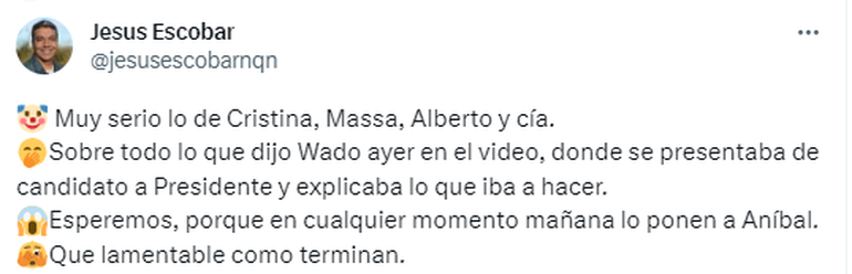 Uno de los primeros políticos locales en en referirse a la candidatura de Massa fue Jesús Escobar, el candidato a presidente por el Movimiento Libres del Sur, quien compartió una foto del ministro de Economía y escribió: "Muy serio lo de Cristina, Massa, Alberto y cía. Sobre todo lo que dijo Wado ayer (jueves) en el video, donde se presentaba de candidato a Presidente y explicaba lo que iba a hacer. Esperemos, porque en cualquier momento mañana lo ponen a Aníbal. Que lamentable como terminan".