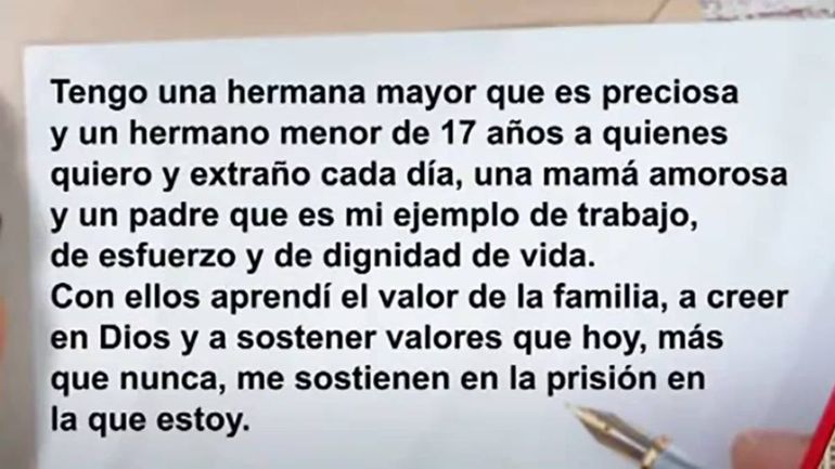 “Tengo una hermana mayor que es preciosa y un hermano menor de 17 años a quienes quiero y extraño cada día, una mamá amorosa y un padre que es mi ejemplo de trabajo, de esfuerzo y de dignidad de vida. Con ellos aprendí el valor de la familia, a creer en Dios y a sostener valores que hoy, más que nunca, me sostienen en la prisión en la que estoy”, se lee al comienzo del texto que se conoció este martes.