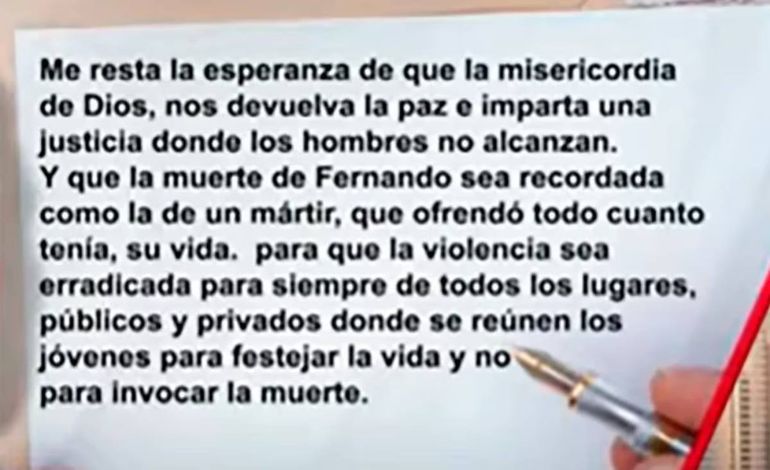 “Me resta la esperanza de que la misericordia de Dios, nos devuelva la paz e imparta una justicia donde los hombres no alcanzan. Y que la muerte de Fernando sea recordada como la de un mártir, que ofrendó todo cuanto tenía, su vida, para que la violencia sea erradicada para siempre de todos los lugares públicos y privados donde se reúnen los jóvenes para festejar la vida y no para invocar la muerte”, aseveró Benicelli.