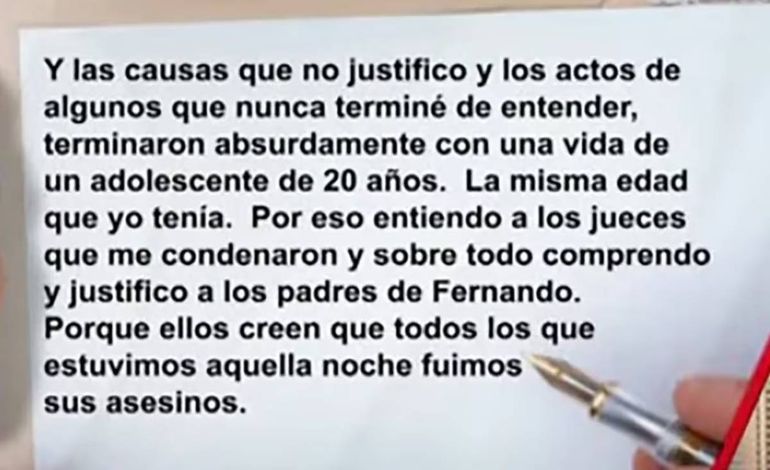 “Y las causas que no justifico y los actos de algunos que nunca terminé de entender, terminaron absurdamente con una vida de un adolescente de 20 años. La misma edad que yo tenía. Por eso entiendo a los jueces que me condenaron y, sobre todo, comprendo y justifico a los padres de Fernando. Porque ellos creen que todos los que estuvimos aquella noche fuimos sus asesinos”, remarcó.