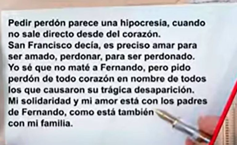 Benicelli concluyó la carta pidiendo perdón: “Pedir perdón parece una hipocresía cuando no sale directo desde del corazón. San Francisco decía, ‘es preciso amar para ser amado, perdonar, para ser perdonado’. Yo sé que no maté a Fernando, pero pido perdón de todo corazón en nombre de todos los que causaron su trágica desaparición. Mi solidaridad y mi amor está con los padres de Fernando, como está también con mi familia”.