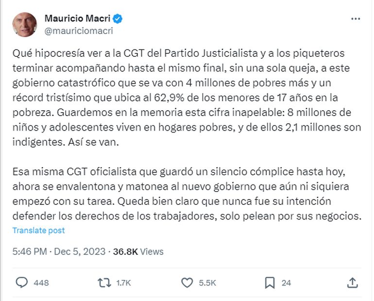 Macri, escribió un acusatorio posteo en su cuenta de X, previamente Twitter. "Qué hipocresía ver a la CGT del Partido Justicialista y a los piqueteros terminar acompañando hasta el mismo final, sin una sola queja, a este gobierno catastrófico que se va con 4 millones de pobres más y un récord tristísimo que ubica al 62,9% de los menores de 17 años en la pobreza", indicó.