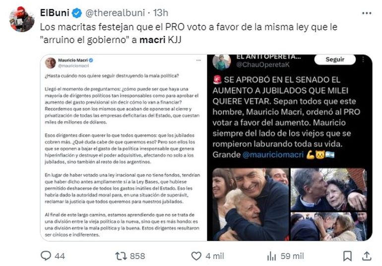 En las redes sociales, la comunidad libertaria y afines a Milei han reaccionado con una mezcla de humor y crítica hacia Macri. Varios usuarios, incluyendo figuras destacadas como Agustín Romo y la cuenta La Derecha Diario, han hecho comentarios sarcásticos y memes en relación con la posición de Macri en la política actual y su pasado en la Agencia Federal de Inteligencia (AFI).