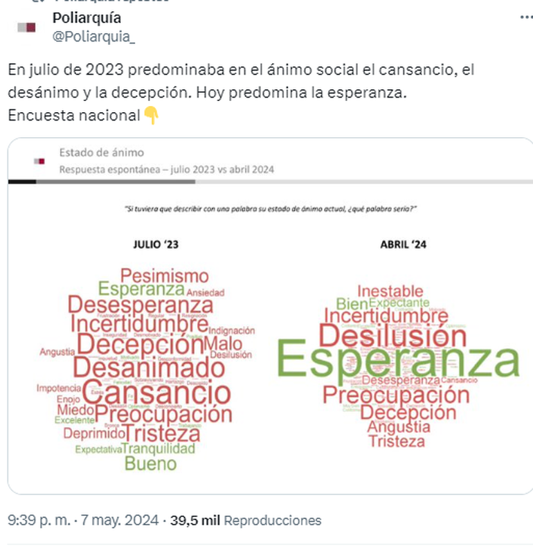 La última encuesta nacional de la consultora Poliarquía reveló un cambio importante en el ánimo social desde julio de 2023 hasta la actualidad, bajo el mandato del presidente Javier Milei. Hace casi un año, predominaban sentimientos de cansancio, desánimo y decepción, pero ahora la esperanza es la emoción principal.