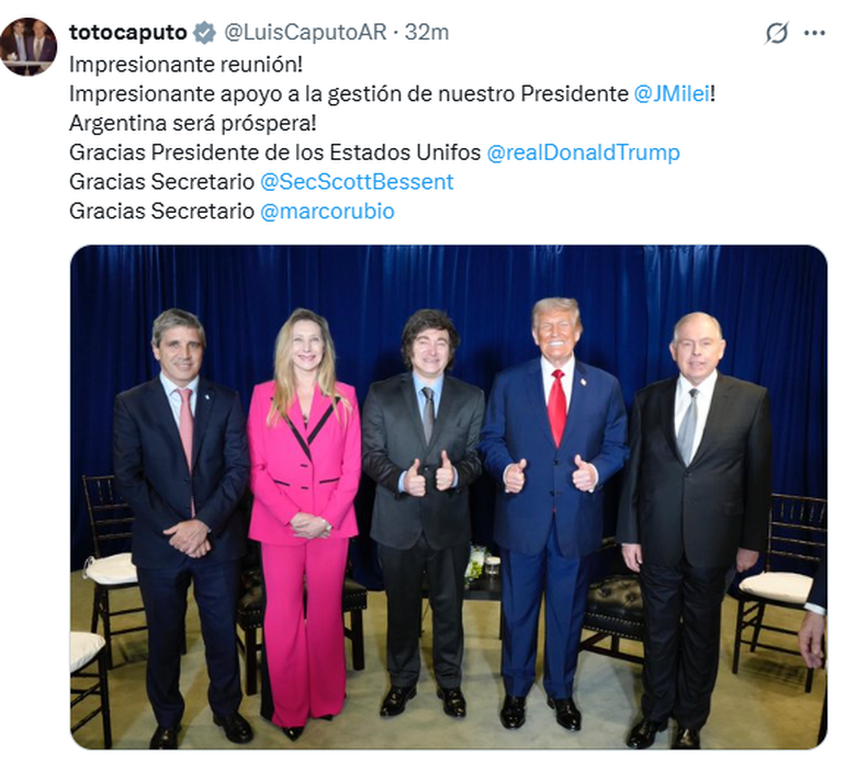 En otra publicación, "Toto" Caputo sostuvo: "Impresionante reunión! Impresionante apoyo a la gestión de nuestro Presidente Milei! Argentina será próspera!", y agradeció al presidente de los Estados Unidos, Donald Trump; el Secretario del Tesoro, Scott Bessent; y el Secretario de Estado Marco Rubio.