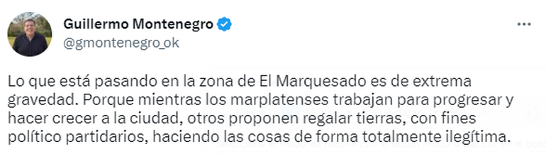 Por su parte, el intendente local, Guillermo Montenegro, dijo a través de sus redes sociales: “Lo que está pasando en la zona de El Marquesado es de extrema gravedad. Porque mientras los marplatenses trabajan para progresar y hacer crecer a la ciudad, otros proponen regalar tierras, con fines político partidarios, haciendo las cosas de forma totalmente ilegítima”.