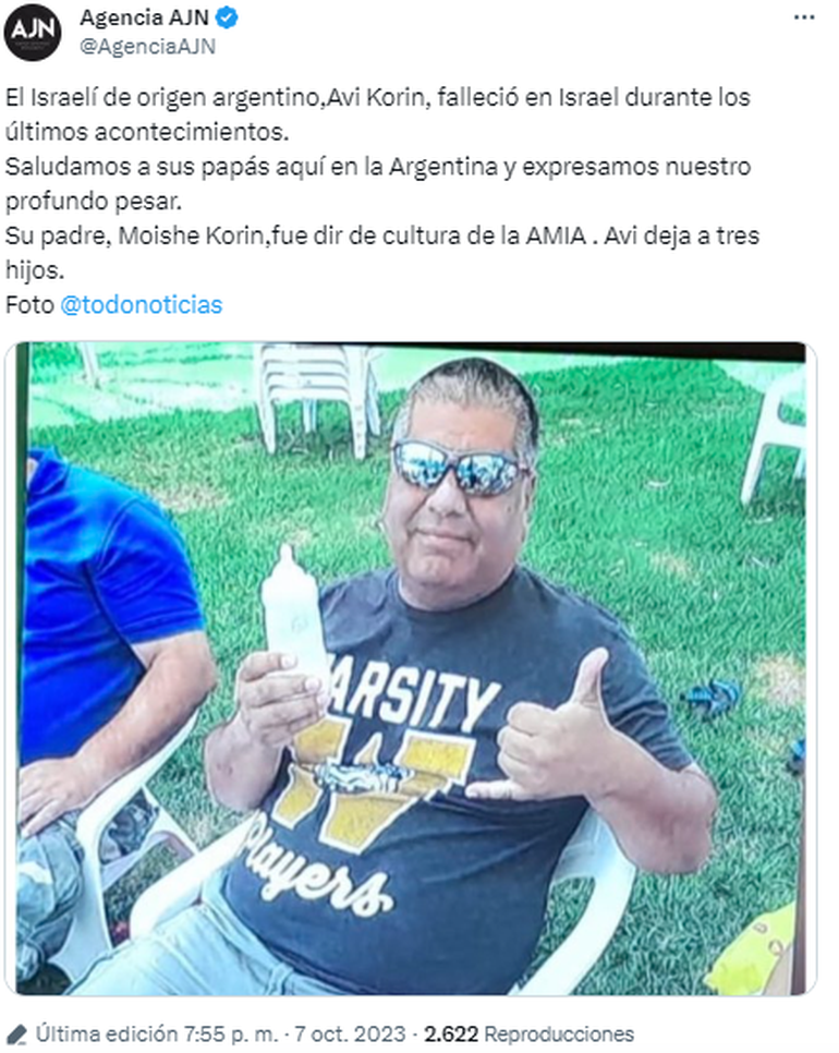 Más tarde, la Agencia Judía de Noticias (AJN) dio cuenta de la muerte de otro argentino, identificado como Avi Korin, también por los ataques. “Saludamos a sus papás aquí en la Argentina y expresamos nuestro profundo pesar”, señaló la agencia en las redes sociales. Precisó que la víctima tenía tres hijos y que su padre, Moishe Korin, fue director de Cultura de la AMIA.