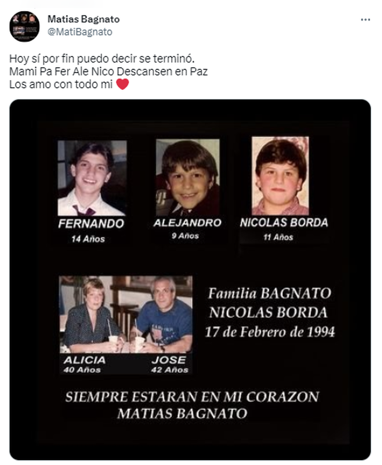 La noticia fue confirmada por autoridades del SPF y por el propio Bagnato, que en su cuenta de Twitter escribió: "Hoy sí por fin puedo decir se terminó. Mami, Pa, Fer, Ale, Nico, Descansen en Paz. Los amo con todo mi corazón".