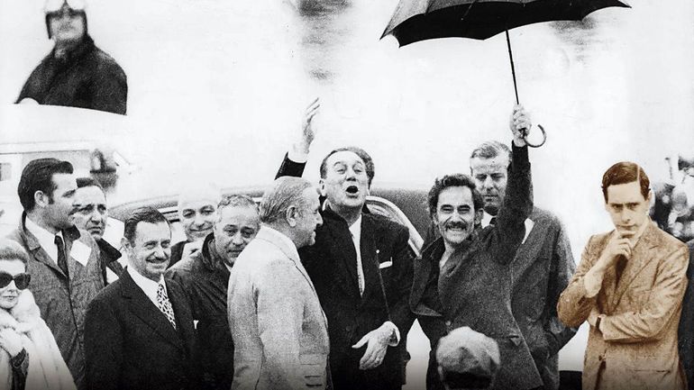 La decisión terminante de la dictadura fue mandarlo al hotel de Ezeiza. Los 300 compañeros de la comitiva permitida para recibirlo estaban en una especie de corralito, a lo lejos. Cuando ve el corralito con la gente, ordena parar el auto. Y fue la primera foto que le sacan, la de Rucci con el paraguas”, relataba Abal Medina en una entrevista que le brindó a Clarín en noviembre de 2022, cuando se cumplían 50 años del operativo retorno.