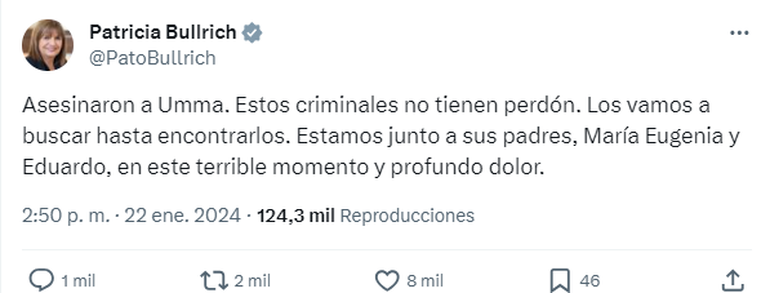 "Asesinaron a Umma. Estos criminales no tienen perdón. Los vamos a buscar hasta encontrarlos. Estamos junto a sus padres, María Eugenia y Eduardo, en este terrible momento y profundo dolor, indicó Bullrich.