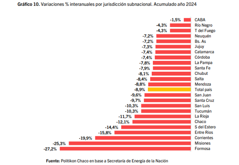 Entre las jurisdicciones subnacionales, todas cerraron el año a la baja. Entre esas, las caídas más leves se observan en Ciudad de Buenos Aires (-1,5%), Río Negro (-4,3%) y Tierra del Fuego (-4,3%); por su parte, las bajas más pronunciadas se ven en Corrientes (-19,9%), Misiones (-25,3%) y Formosa (-27,2%).