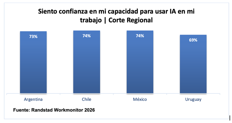 El estudio agrega que, al profundizar en los datos regionales, surge que los trabajadores de Argentina, Chile y México comparten un mayor nivel de confianza en sus capacidades para la adopción de herramientas de IA, de entre 4 y 5 puntos por encima de la media global, marcando una diferencia con Uruguay, donde el 69% del talento afirma sentirse confiado en su capacidad para utilizar inteligencia artificial en el trabajo.