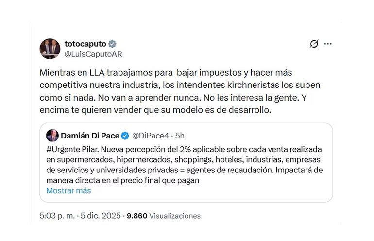Días atrás, Caputo ya había realizado una fuerte crítica al conocer la medida aplicada. "Mientras en LLA trabajamos para bajar impuestos y hacer más competitiva nuestra industria, los intendentes kirchneristas los suben como si nada. No van a aprender nunca", posteó en X.