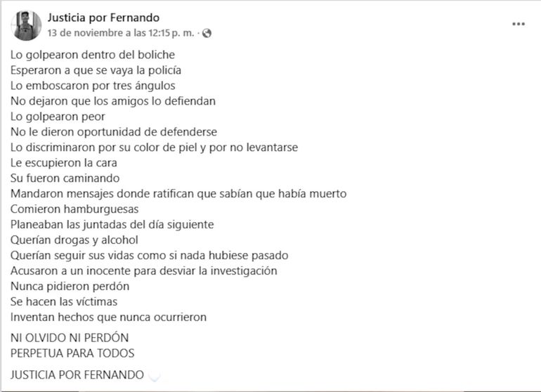 Al finalizar el posteo, sentenció: "Ni olvido ni perdón. Justicia para todos. Perpetua por Fernando".
