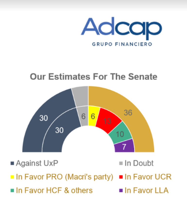 “A medida que nos acercamos a la votación del Senado sobre el Proyecto de Ley Ómnibus y el Paquete Fiscal, nuestras estimaciones señalan 36 votos a favor, 30 en contra y 6 en duda. En un hipotético empate a 36 la vicepresidente Villarruel la definiría a favor en su rol de presidenta del Senado”, señaló en un informe a inversores la sociedad de bolsa Adcap Grupo Financiero.