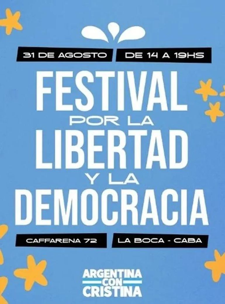 Los seguidores de Cristina Kirchner se volverán a juntar para pedir su liberación. Lo harán este domingo 31 de agosto en el barrio porteño de La Boca, donde a partir de las 14 horas convocaron a un festival por "la libertad y la democracia", en apoyo de la expresidenta y actual titular del Partido Justicialista (PJ) Nacional.