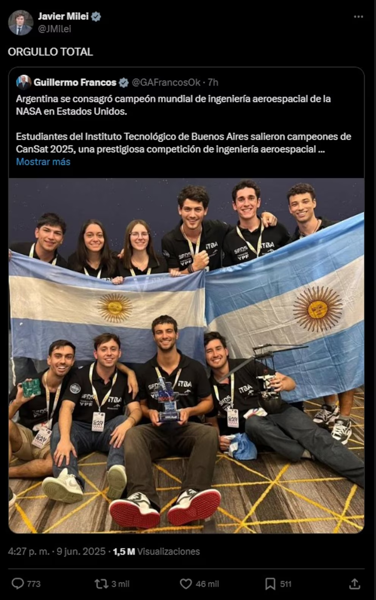 La cuenta oficial de la Oficina del Presidente celebró el encuentro entre los jóvenes y el mandatario en redes sociales. “El Presidente Javier Milei recibió en Casa Rosada al equipo argentino campeón del Mundial 2025 de la CanSat Competition”, publicaron en X. En otra publicación destacaron que los estudiantes llevaron el satélite con el que lograron la hazaña.