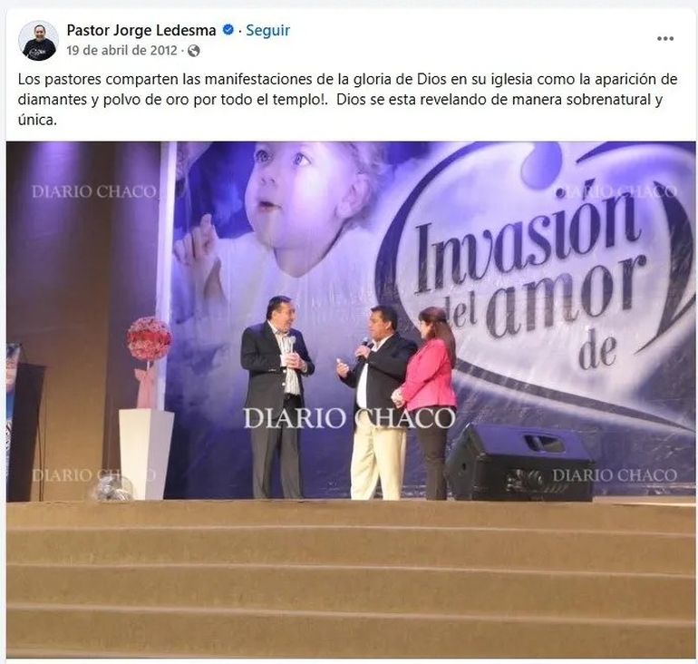 En publicaciones que realizó entre 2011 y 2013 en su cuenta de Facebook, el pastor relató la "aparición de diamantes y polvo de oro por todo el templo" algo que, según confirmaba, "Dios se está revelando de manera sobrenatural y única". En estas publicaciones, que reveló Diario Chaco, muestra que el hombre de la iglesia evangélica compartía imágenes de polvo de oro y diamantes que aparecían milagrosamente.