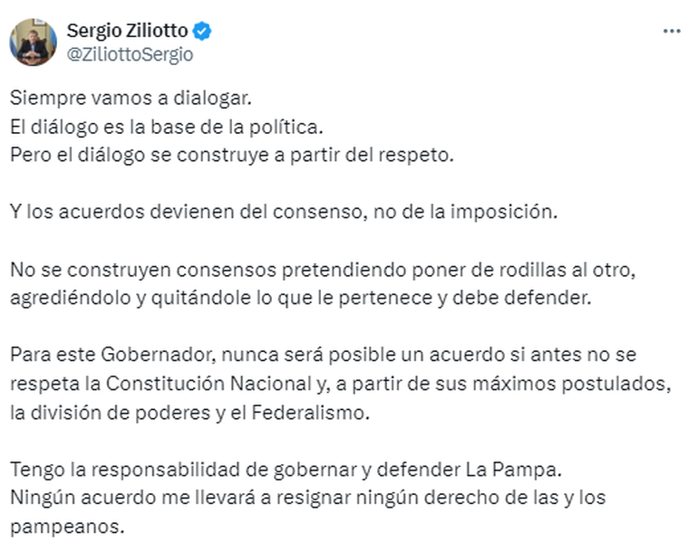 "Para este Gobernador, nunca será posible un acuerdo si antes no se respeta la Constitución Nacional y, a partir de sus máximos postulados, la división de poderes y el Federalismo", expresó Ziliotto a través de un mensaje en redes sociales.