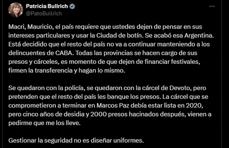 "Macri, Mauricio, el país requiere que ustedes dejen de pensar en sus intereses particulares y usar la Ciudad de botín. Se acabó esa Argentina", lanzó Bullrich en su cuenta de X (ex Twitter), dejando en claro su ruptura política con el exmandatario. Además, aseguró que todas las provincias se hacen cargo de sus presos y cárceles, por lo que la Ciudad debería hacer lo mismo.
