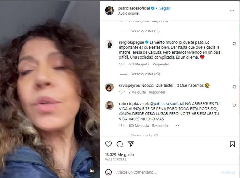 Según explicó Patricia, pese al momento de sorpresa tuvo una rápida reacción y le pegó un "manotazo" que provocó que el teléfono cayera al piso y, de este modo, poder recuperarlo. Sin embargo, esto llevó a la cantante de rock a hacerse un planteo que quiso compartir con sus seguidores: "Entonces yo pienso, qué hago ayudo como acostumbro a hacer y me arriesgo a un golpe en el brazo como el que me acaba de dar o sigo de largo, tengo miedo que es lo que no quiero hacer y estoy en esa disyuntiva".