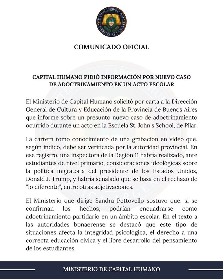Frente a esta difusión, la cartera que dirige Sandra Petovello solicitó a la Dirección General de Cultura y Educación de la Provincia de Buenos Aires que informe sobre "un presunto nuevo caso de adoctrinamiento".