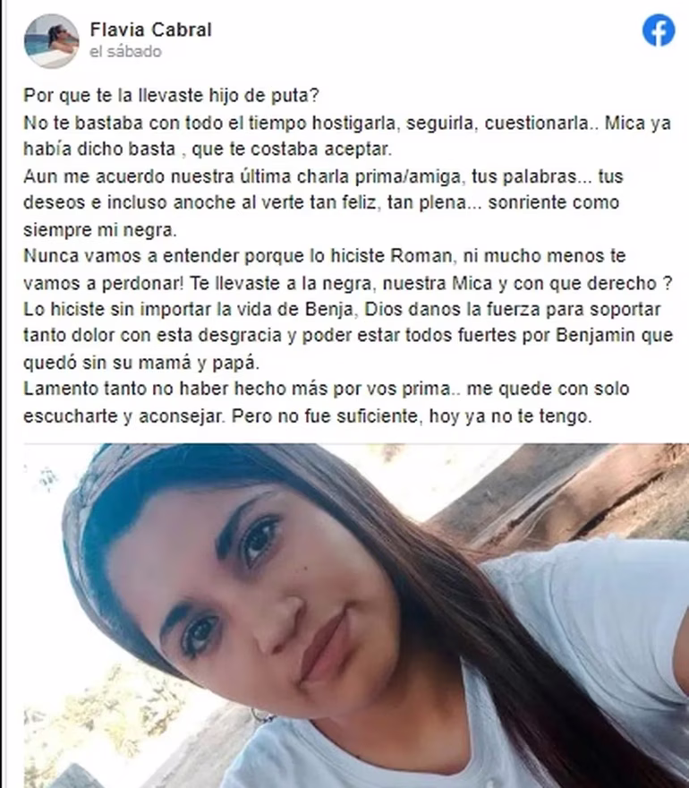“No te bastaba con hostigarla todo el tiempo, seguirla, cuestionarla...Mica ya había dicho basta, qué te costaba aceptar (...) Nunca vamos a entender por qué lo hiciste Román, ni mucho menos te vamos a perdonar! Te llevaste a la negra, nuestra Mica y con qué derecho? Lo hiciste sin importar la vida de Benja, Dios danos la fuerza para soportar tanto dolor con esta desgracia y poder estar todos fuertes por Benjamín que quedó sin su mamá y papá”, escribió en las redes una allegada a la víctima.