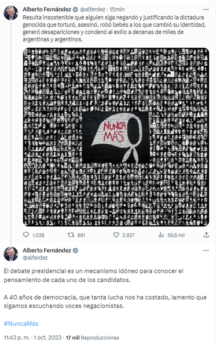 El presidente Alberto Fernández afirmó este domingo por la noche que "resulta insostenible que alguien siga negando y justificando la dictadura genocida" en relación con los dichos del candidato presidencial de La Libertad Avanza, Javier Milei, durante el primer debate que se realizó en Santiago del Estero, en los que negó que los desaparecidos en la dictadura hayan sido 30 mil.