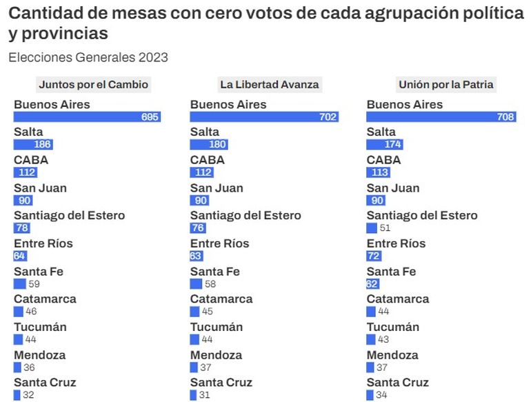 La provincia con el mayor registro de mesas que tienen al menos una fuerza sin votos es Buenos Aires: allí Unión por la Patria tuvo 708 mesas sin votos, La Libertad Avanza, 702 y Juntos por el Cambio, 695.