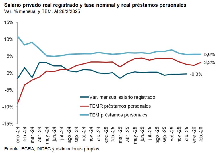 El reporte de Quantum compara el índice de salario formal del sector privado y la tasa de interés real de un préstamo personal. "Se observa que entre diciembre de 2023 hasta mayo de 2024 la variación mensual del salario real fue superior a la tasa de interés real". "Pero, a partir de julio de 2024 la tasa de interés real mensual no sólo es positiva, sino que supera a la variación del salario real en forma continua, generando una diferencia acumulada significativa#, explica el reporte.