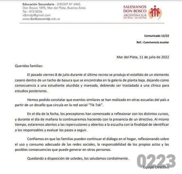 Hasta el día de hoy, el colegio aún no logró identificar a los autores del challenge de TikTok, donde utilizan una botella y mezclan productos para generar una reacción química. En ese sentido, Zabaleta planteó: “Las autoridades me dicen que no saben nada, que si ha sido una sola persona o, si fueron varios, que han hecho un pacto de silencio; incluso puede ser que las mismas familias los estén cubriendo. Vi tantas irregularidades que me permito desconfiar que no lo sepan”. La UFI N°11 de Mar del Plata tomó intervención en la causa.