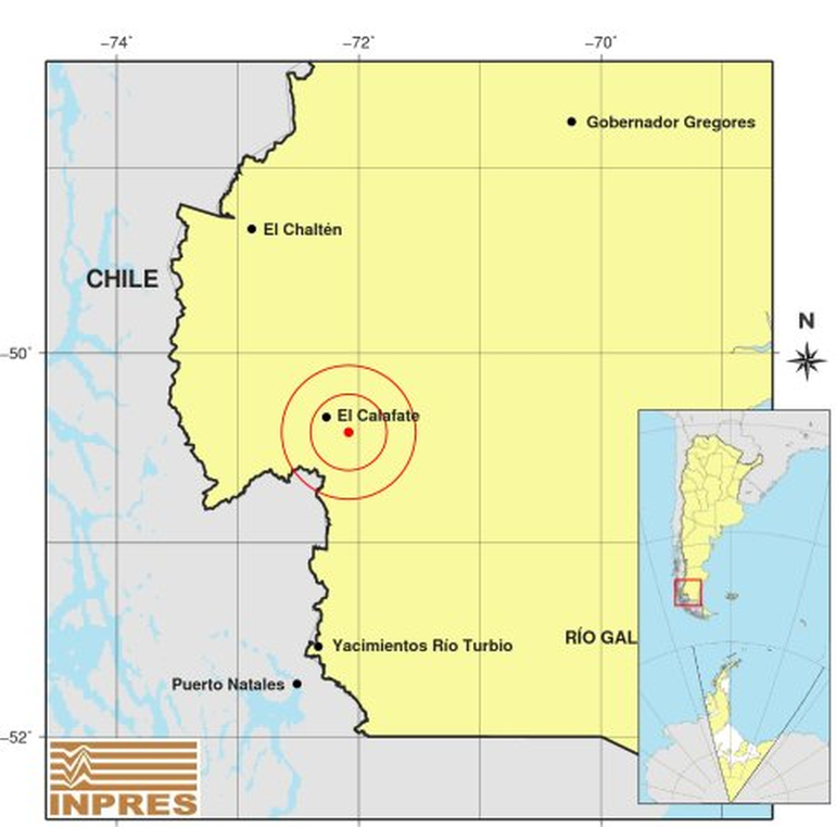 El Epicentro: 17 km al SE de El Calafate; 124 km al N de Río Turbio; 137 km al SE de El Chaltén -50.420 (lat) -72.084 (long).
