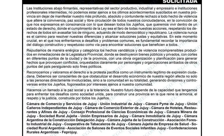 En este contexto, los empresarios de la provincia publicaron una solicitada en la que manifestaron su “profundo rechazo a todo hecho de violencia que altere la convivencia, paz social y libre circulación de todos nuestros conciudadanos, en la convicción de que nos expresamos en consonancia con lo que desean todos los Jujeños, que queremos vivir dentro de un estado de derecho”.