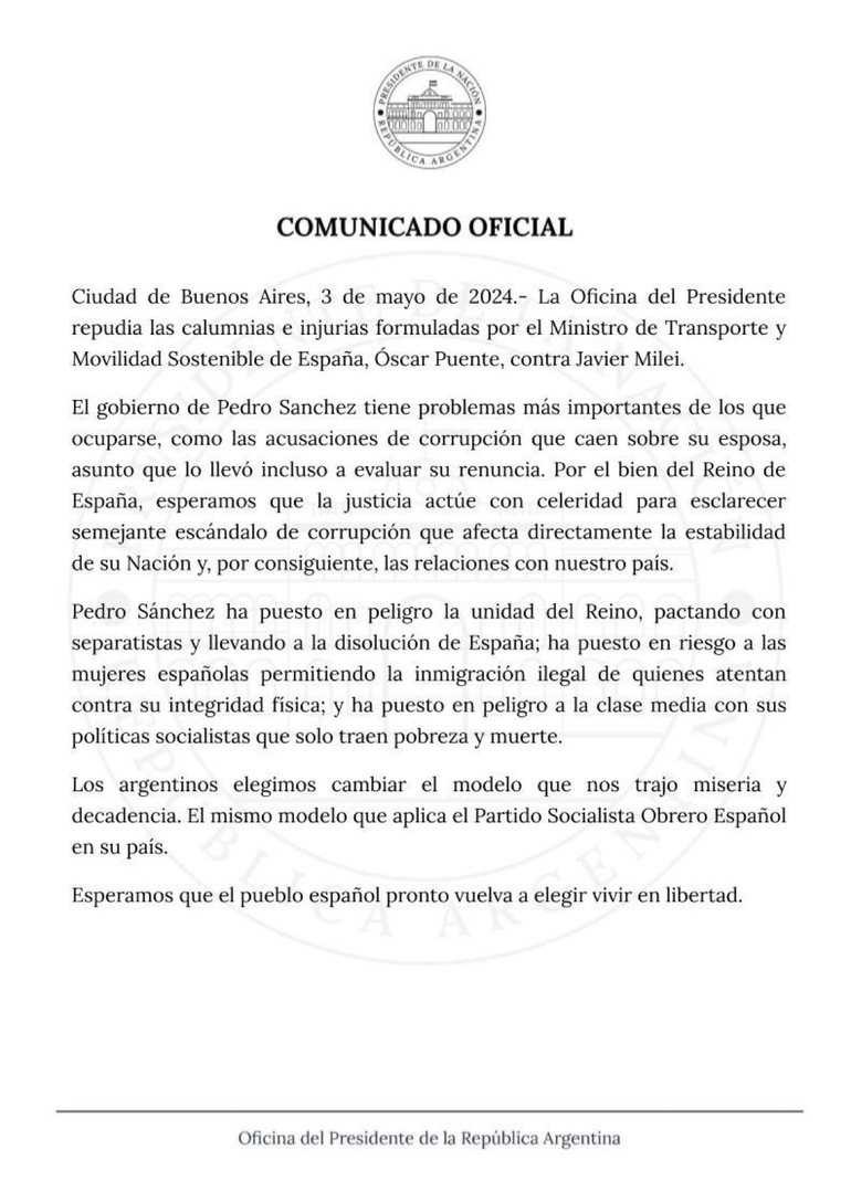 El Gobierno español rechazó el duro comunicado que había emitido la Casa Rosada en medio del cruce de declaraciones entre el ministro de Transporte ibérico, Óscar Puente, y el presidente Javier Milei y afirmó que las expresiones del texto difundido "no se corresponden con las relaciones de dos países y pueblos hermanos".