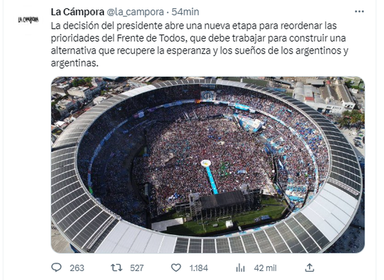 "La decisión del Presidente abre una nueva etapa para reordenar las prioridades del Frente de Todos, que debe trabajar para construir una alternativa que recupere la esperanza y los sueños de los argentinos y argentinas.", publicó La Cámpora en su Twitter.