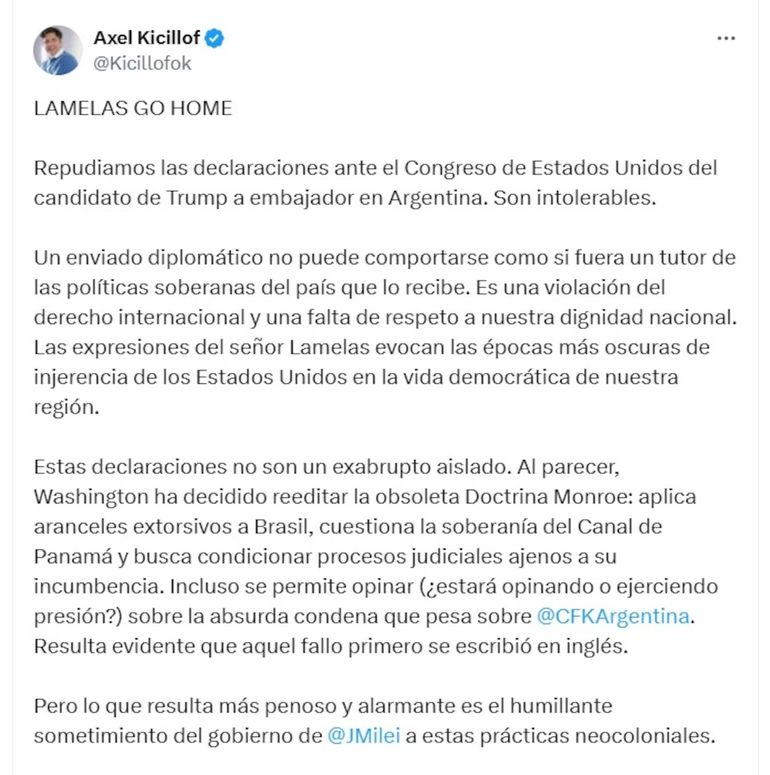 Respecto a las declaraciones de Lamelas sobre los elogios al presidente Javier Milei, prometer una alianza "sin precedentes" y cargar en contra de la presencia de China en el país, y apuntar contra CFK, varios gobernadores salieron a criticar sus afirmaciones. Entre ellos, Axel Kicillof (Provincia de Buenos Aires), Sergio Ziliotto (La Pampa), Ricardo Quintela (La Rioja) y Gustavo Melella (Tierra del Fuego).