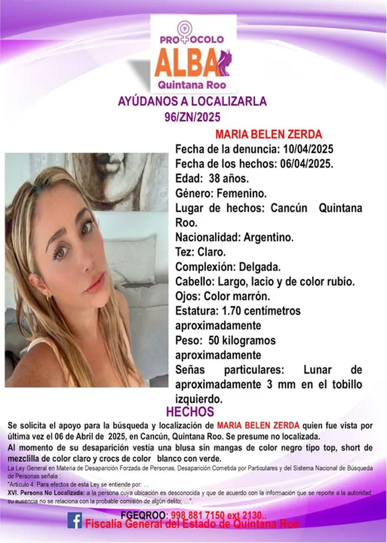 Se trata de María Belén Zerda, de 38 años, quien fue vista por última vez el domingo 6 de abril de 2025 en el municipio de Benito Juárez y, ante esta situación, la Fiscalía General del Estado (FGE) de Quintana Roo activó el Protocolo Alba, un mecanismo destinado a la búsqueda de mujeres desaparecidas, y difundió una ficha oficial con los datos personales de Zerda.